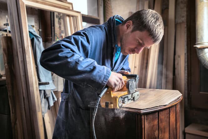 Tatsächlich ist es möglich, sich einen stationären Bandschleifer auch selbst zu bauen. Das funktioniert, indem man ein mobiles Gerät zu einem stationären Bandschleifer macht. Dafür muss man diesen Bandschleifer auf einem Tisch oder auch auf einer Werkbank befestigen. Das kann man aber nur dann empfehlen, wenn man eher kleinere Werkstücke bearbeiten möchte. Schließlich verändert sich ja nicht die Größe des Schleifbandes. Wenn es sich um größere und professionellere Projekte handelt, wird empfohlen, einen richtigen Bandschleifer zu verwenden. Für Kunsthandwerker und aktive Heimwerker gehört ein stationärer Bandschleifer einfach mit zur handwerklichen Grundausstattung. Das heißt dann in normalerweise auch, dass der Bandschleifer eine eigene Werkbank bekommt. So muss man nicht lange überlegen, ob es sich lohnt, den Platz für einen Bandschleifer freizuräumen, wenn man ihn braucht. Wenn man zum Beispiel selbst gebaute Möbelstücke gründlich abschleifen möchte, viel mit großen Werkstücken arbeitet, wie beispielsweise Türen, wo man die alte, abgesplitterte Farbe entfernen will, dann ist der stationäre Bandschleifer sehr wahrscheinlich genau das Gerät, was man dafür braucht.